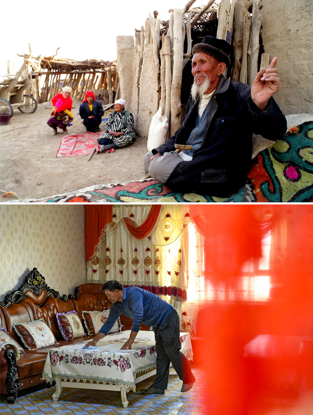 拼版照片:上图为1999年在新疆巴音郭楞蒙古自治州尉犁县喀尔曲尕乡拍摄的村民和他们居住的“土块房”;下图为2025年9月20日,新疆巴音郭楞蒙古自治州尉犁县喀尔曲尕乡村民艾尔肯·哈斯木在家中。
