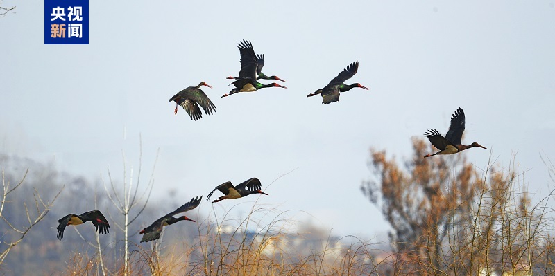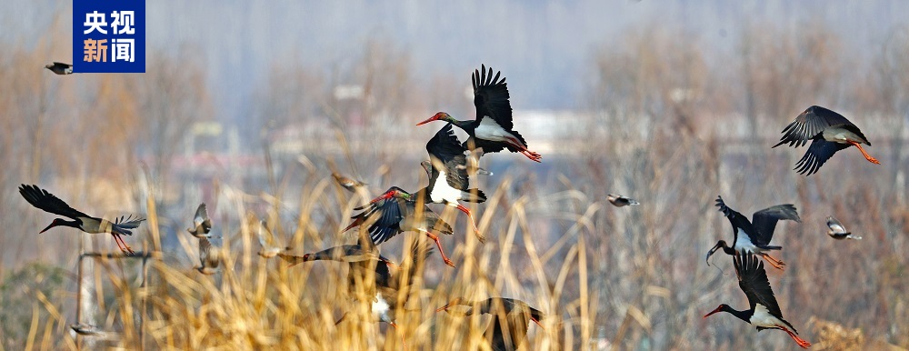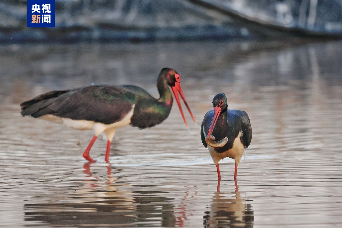 近日,在陕西西安长安区十里蛤蟆滩连片稻田里,一群红嘴红腿、身披黑羽的鸟儿正低头觅食,偶尔展翅盘旋,它们就是有“鸟类大熊猫”之称的国家一级保护野生动物——黑鹳。