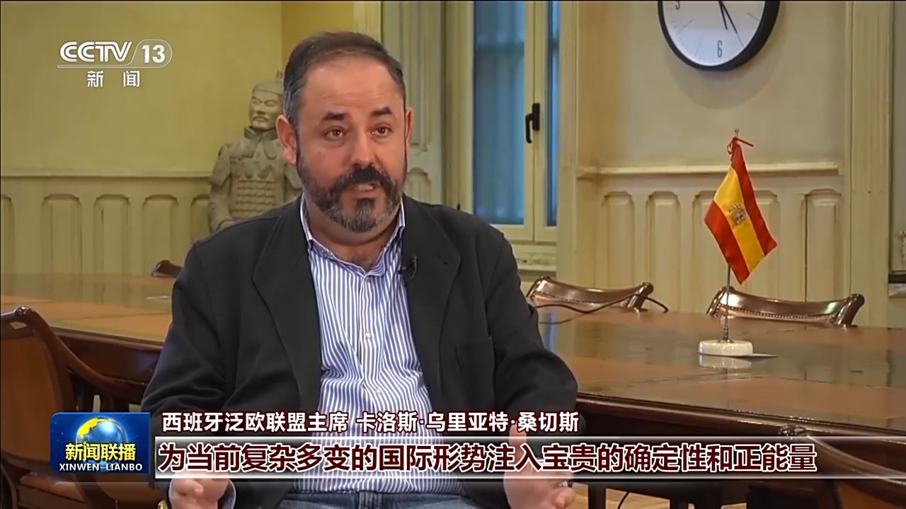 西班牙泛欧联盟主席 卡洛斯·乌里亚特·桑切斯:习近平主席发表的新年贺词为当前复杂多变的国际形势注入宝贵的确定性和正能量,习主席提出的一系列全球倡议立足于造福全人类。中国还积极应对气候变化,在可持续发展方面为世界提供了重要借鉴。中国坚持合作共赢的理念,让中国的发展成果惠及更多国家和人民。