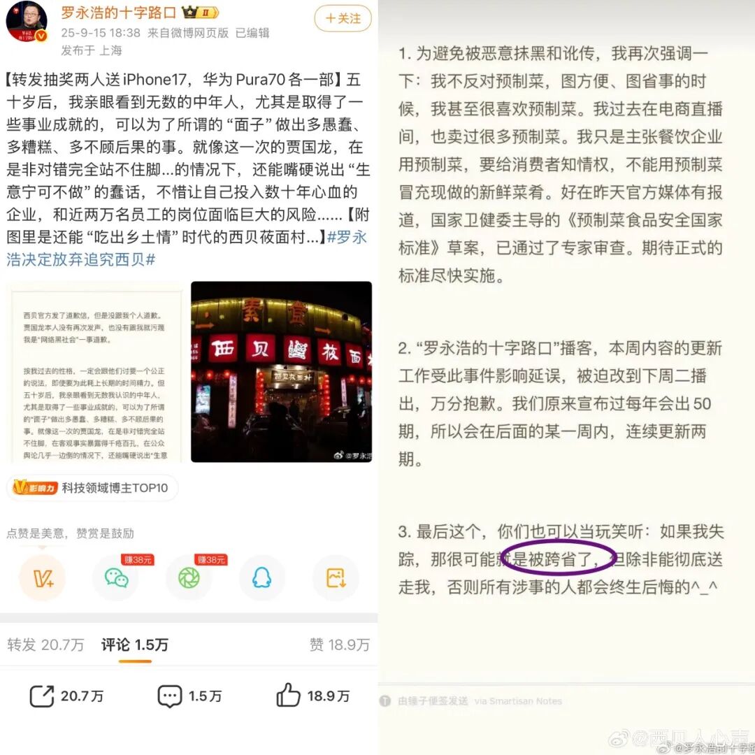 罗永浩提到鸿茅药酒事件中的谭秦东,话里话外就是我贾国龙会在内蒙古自治区勾结关系跨省抓他,之前他也发过同样的内容(2025年9月15日)(图2)。四个月过去了,大家看评论区,当时辱骂我、辱骂贝是黑道的、辱骂内蒙古的有多少?给我个人、给西贝品牌、给内蒙古造成了多大伤害?罗永浩无中生有的目的,无非是想让有关部门投鼠忌器,即使他违法了也不敢动他。