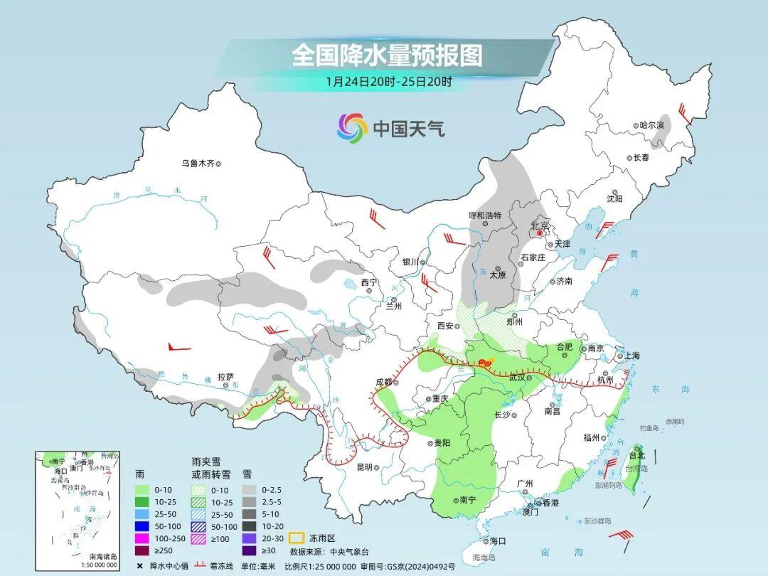 第一轮(25–27日):华北、东北地区南部、黄淮北部等地有小到中雪,黄淮中部、陕西南部有雨夹雪,河南南部、湖北北部等地局部有冻雨;江汉东部、江淮、江南、华南及贵州等地有小雨。