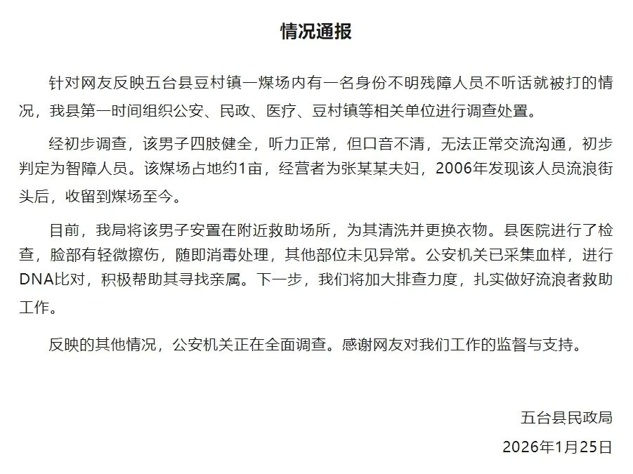 1月25日晚,山西五台县民政局发布情况通报称,针对网友反映五台县豆村镇一煤场内有一名身份不明残障人员不听话就被打的情况,该县第一时间组织公安、民政、医疗、豆村镇等相关单位进行调查处置。
