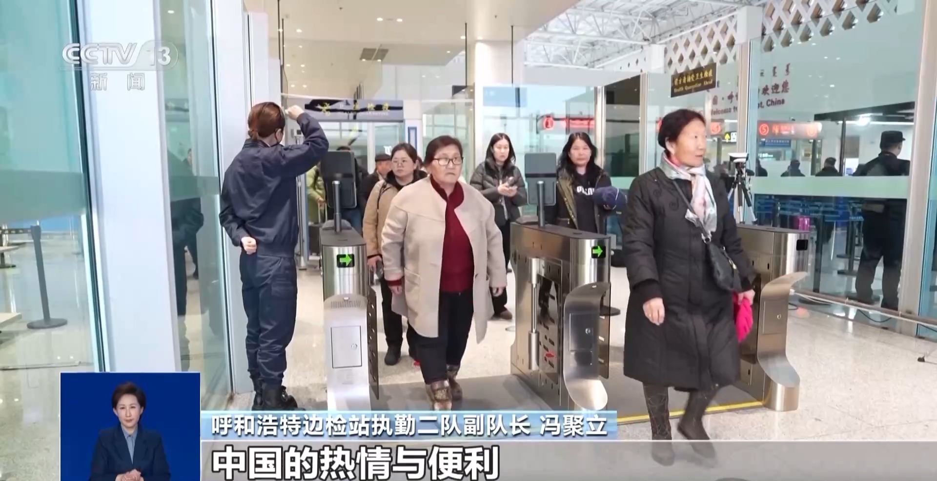 呼和浩特边检站执勤二队副队长 冯聚立:我们优化查验流程,共开设人工查验通道6条、快捷通道3条,并在现场配备手持翻译设备,加强多语言引导服务,使旅客平均通关时间缩短20%,基本实现“随到随检、顺畅通关”,让外国游客第一时间感受到中国的热情与便利。