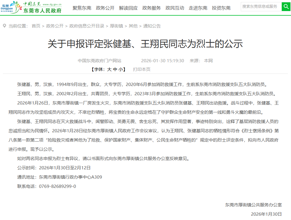 1月30日,广东东莞市厚街镇人民政府官网发布《关于申报评定张健基、王翔民同志为烈士的公示》。