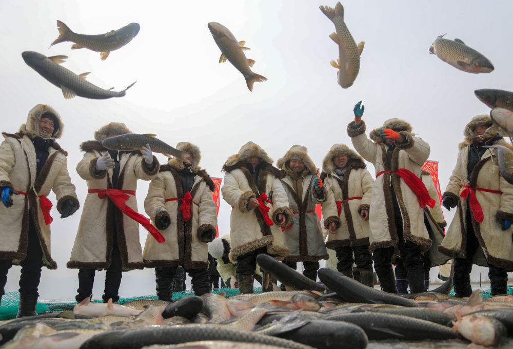 1月18日,渔民在博湖县博斯腾湖冰面上进行冬捕作业。这次巨网冬捕活动,吸引各地游客前来观赏。 新华社发(年磊摄)