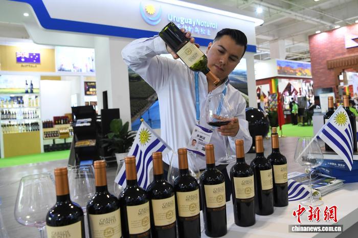 2021年7月9日,第27届中国兰州投资贸易洽谈会展馆内,主宾国乌拉圭展馆的工作人员介绍乌拉圭红酒。中新社记者 杨艳敏 摄