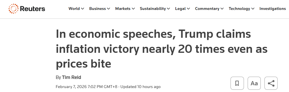 路透社近日报道称,美国总统在多场经济主题讲话中反复宣称“通胀已被击败”“物价正在下降”,但相关表述与当前经济数据,以及众多美国民众的实际感受并不一致。