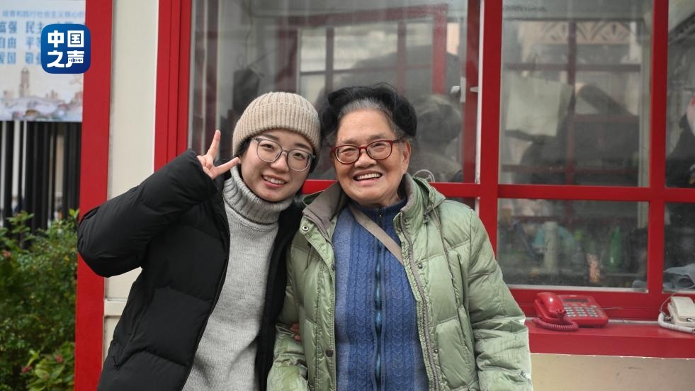 陈真与沈奶奶在电话亭前合影