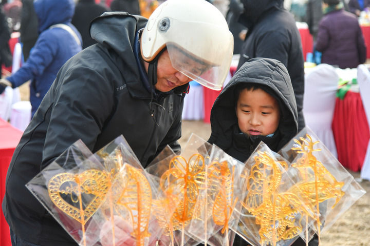 1月30日,小朋友在山东泰安大集上挑选糖画。新华社记者 朱峥 摄