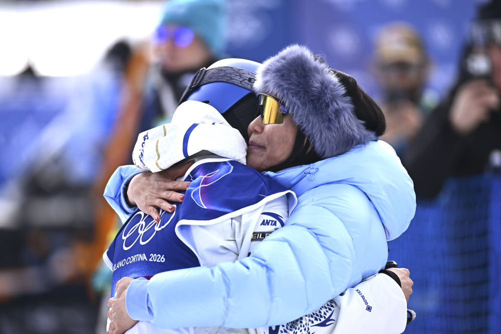 2月9日,谷爱凌(左)在完成第一跳后和妈妈拥抱。新华社记者 张宏祥 摄