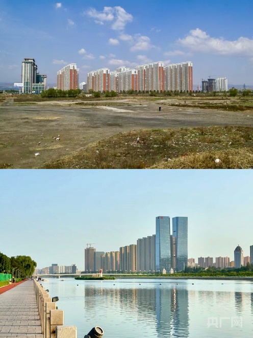 曾经的汾河岸边杂草丛生(上图),如今汾河两岸碧波锦绣(下图)(央广网发 崔和平 摄)