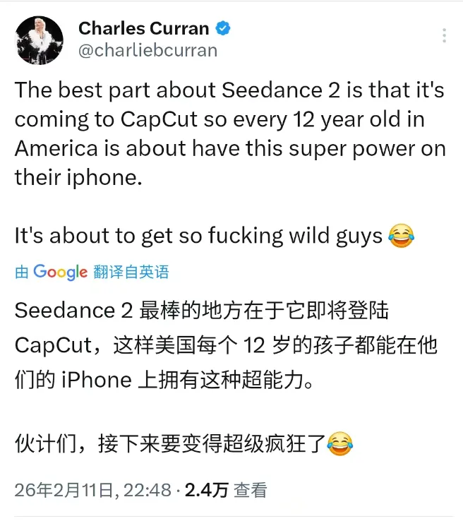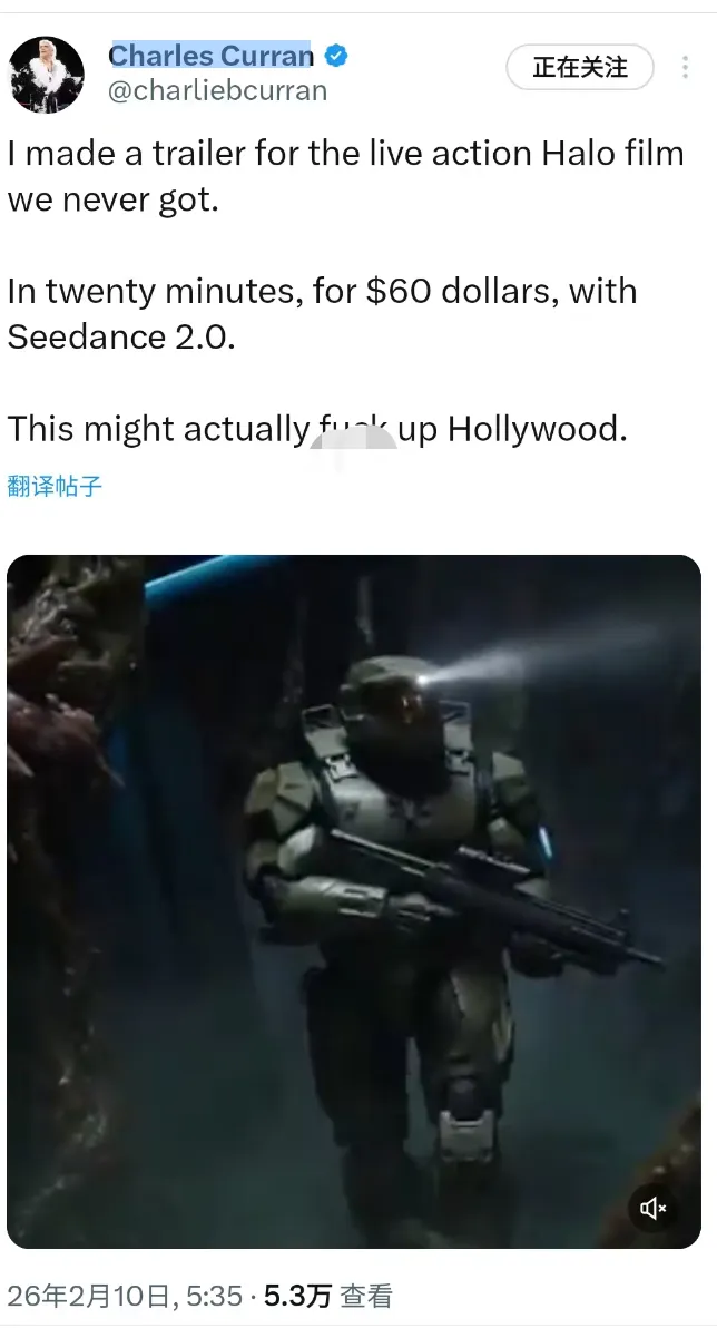 导演Charles Curran在社交平台连续发文,他为从未面世的真人电影制作了一版预告片,仅用20分钟,花费60美元,借助Seedance 2.0完成,“这玩意儿说不定真能搞砸好莱坞呢。”