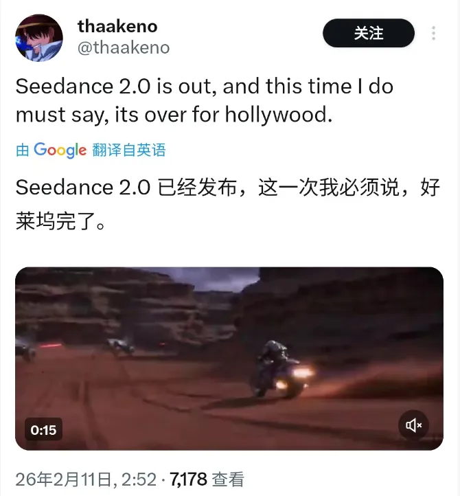 据参考消息报道,多位美国导演或影视从业者在使用Seedance 2.0之后,公开表达了诸如“好莱坞要完蛋了”或“这东西说不定真能搞垮好莱坞”的感慨。