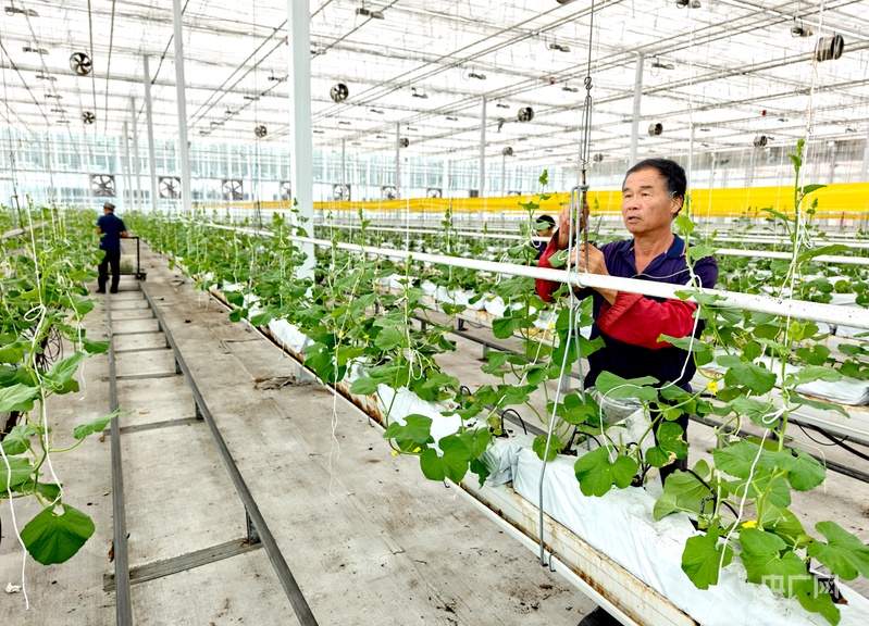 在丹河设施蔬菜标准化生产示范园内,工作人员正在对甜瓜苗打杈(央广网记者 唐磊 摄 )