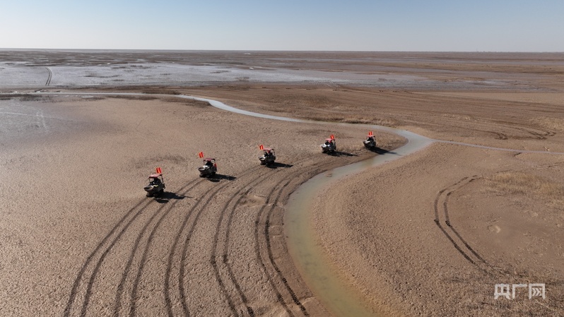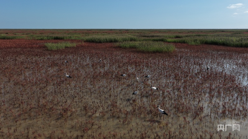 上图为2023年2月,山东黄河三角洲国家级自然保护区正在进行翅碱蓬机械撒种。下图为2025年8月,修复后的生态环境吸引了包括东方白鹳在内的多种鸟类前来觅食。(央广网发 杨斌 摄)