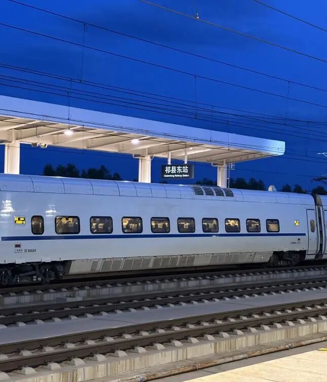 银白的高铁列车静卧在轨道上,交错的电线与延伸的轨道在暮色中延伸向远方,带着一种奔赴与归期的诗意,仿佛下一刻列车就会划破蓝夜,载着旅人驶向目的地。