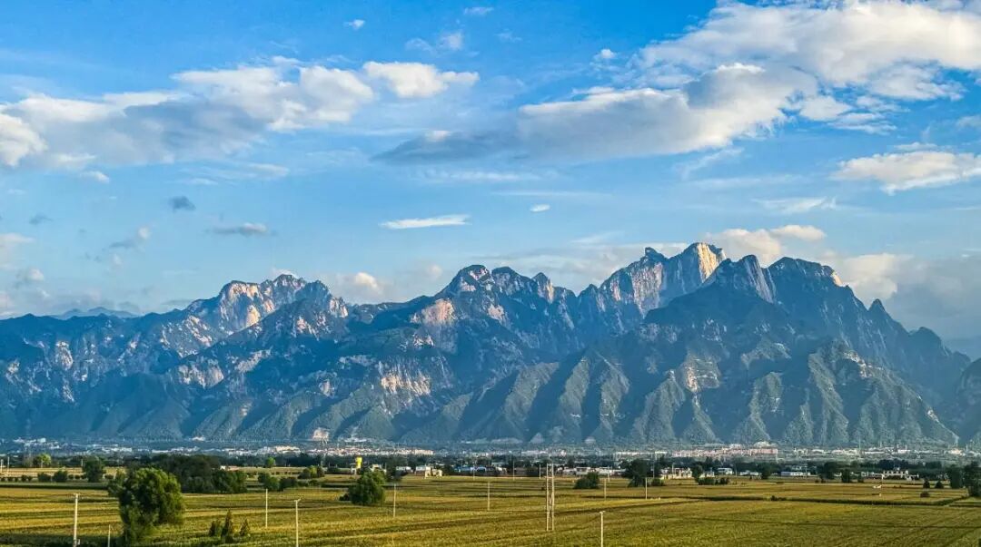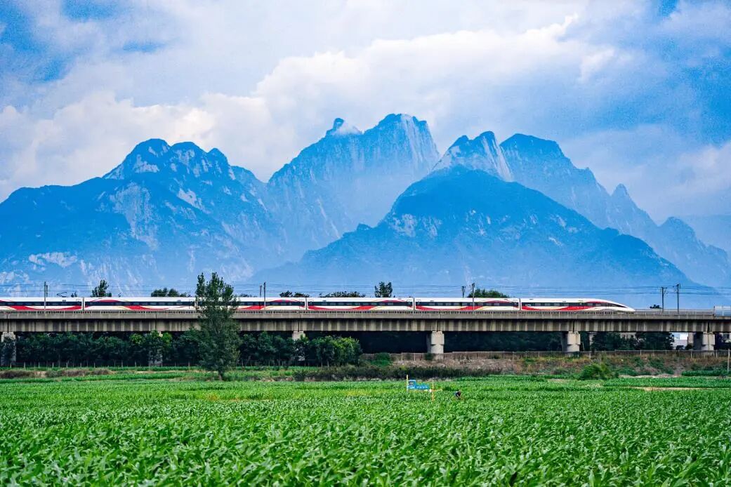 雨过天晴,华山顶浮着层叠白云,如戴玉冠。山脚下,玉米田碧浪翻涌,农人俯身耕耘的身影嵌在绿意里。复兴号智能动车组正呼啸而过,银白车身与古朴山景、田园生机相映,织就一幅传统与现代共舞的画卷。