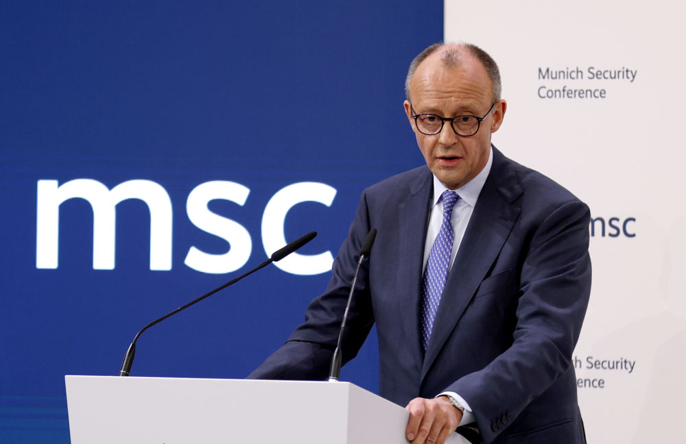 2月13日,在德国慕尼黑,德国总理默茨在第62届慕尼黑安全会议开幕式上致辞。新华社记者李颖摄