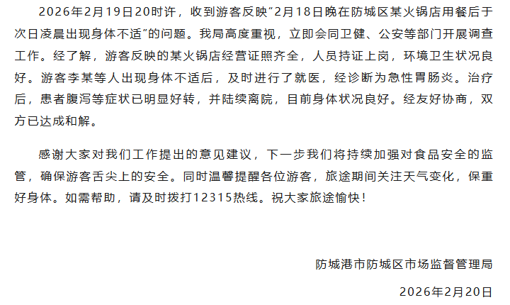 央视网消息:2月21日,广西防城港市防城区市场监督管理局发布情况通报:2月19日20时许,收到游客反映“2月18日晚在防城区某火锅店用餐后于次日凌晨出现身体不适”的问题。我局高度重视,立即会同卫健、公安等部门开展调查工作。经了解,游客反映的某火锅店经营证照齐全,人员持证上岗,环境卫生状况良好。游客李某等人出现身体不适后,及时进行了就医,经诊断为急性胃肠炎。治疗后,患者腹泻等症状已明显好转,并陆续离院,目前身体状况良好。经友好协商,双方已达成和解。