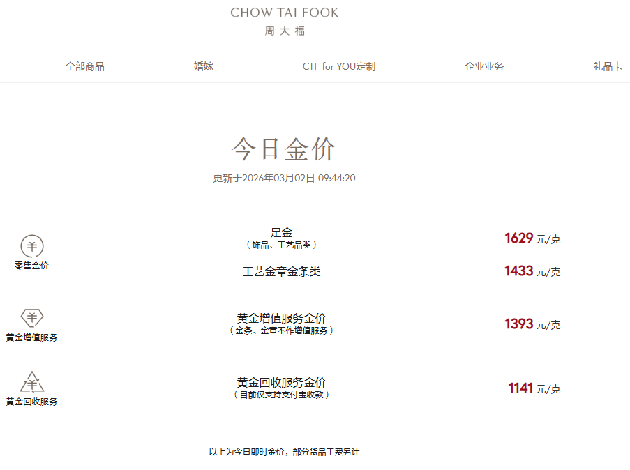国内各品牌金饰克价大涨。周大福1629元/克,周生生1622元/克,老庙黄金1642元/克,老凤祥1620元/克。