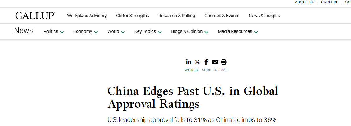 此项民调是盖洛普于2025年在130多个国家进行的,对比了中国、美国、德国、俄罗斯四国的全球领导力。报告强调,调查早于2026年初发生的几项重大事件,包括美国退出66个国际组织以及2月底对伊朗的军事行动。
