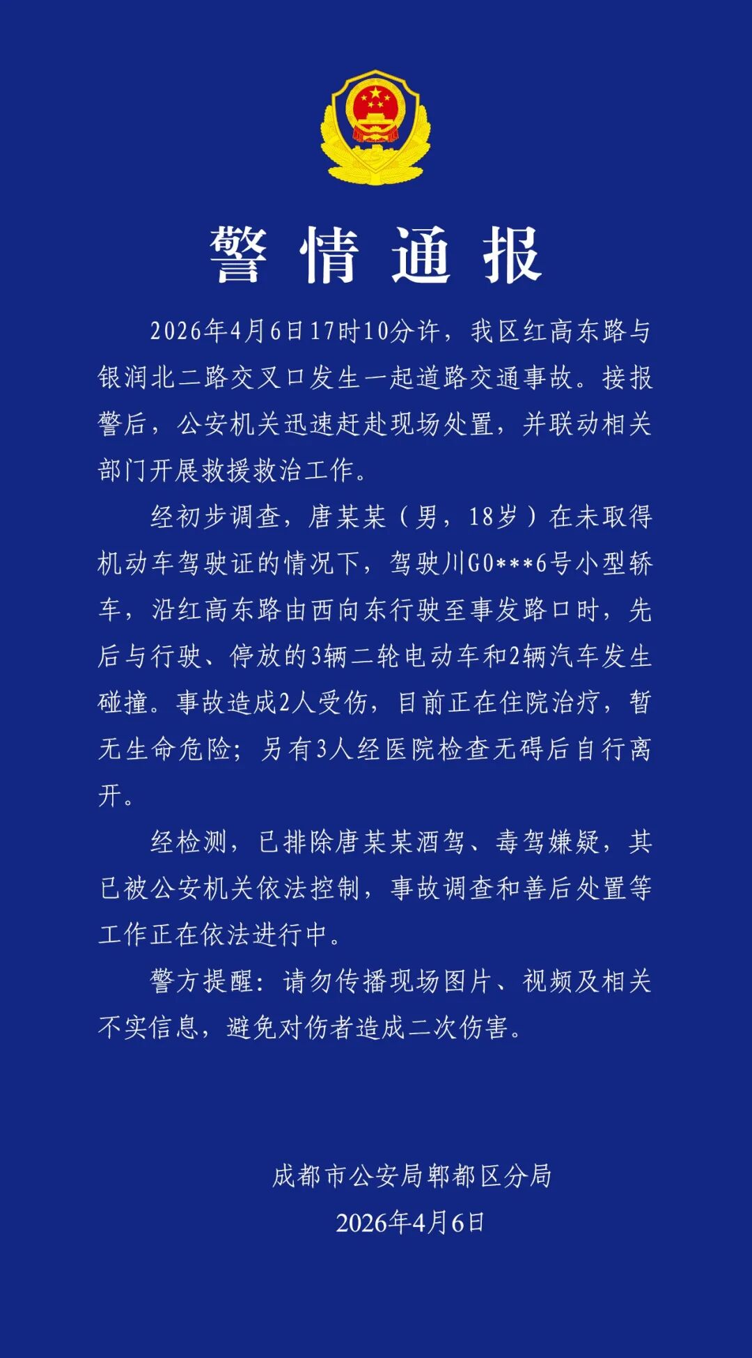 经初步调查,唐某某(男,18岁)在未取得机动车驾驶证的情况下,驾驶川G0***6号小型轿车,沿红高东路由西向东行驶至事发路口时,先后与行驶、停放的3辆二轮电动车和2辆汽车发生碰撞。事故造成2人受伤,目前正在住院治疗,暂无生命危险;另有3人经医院检查无碍后自行离开。