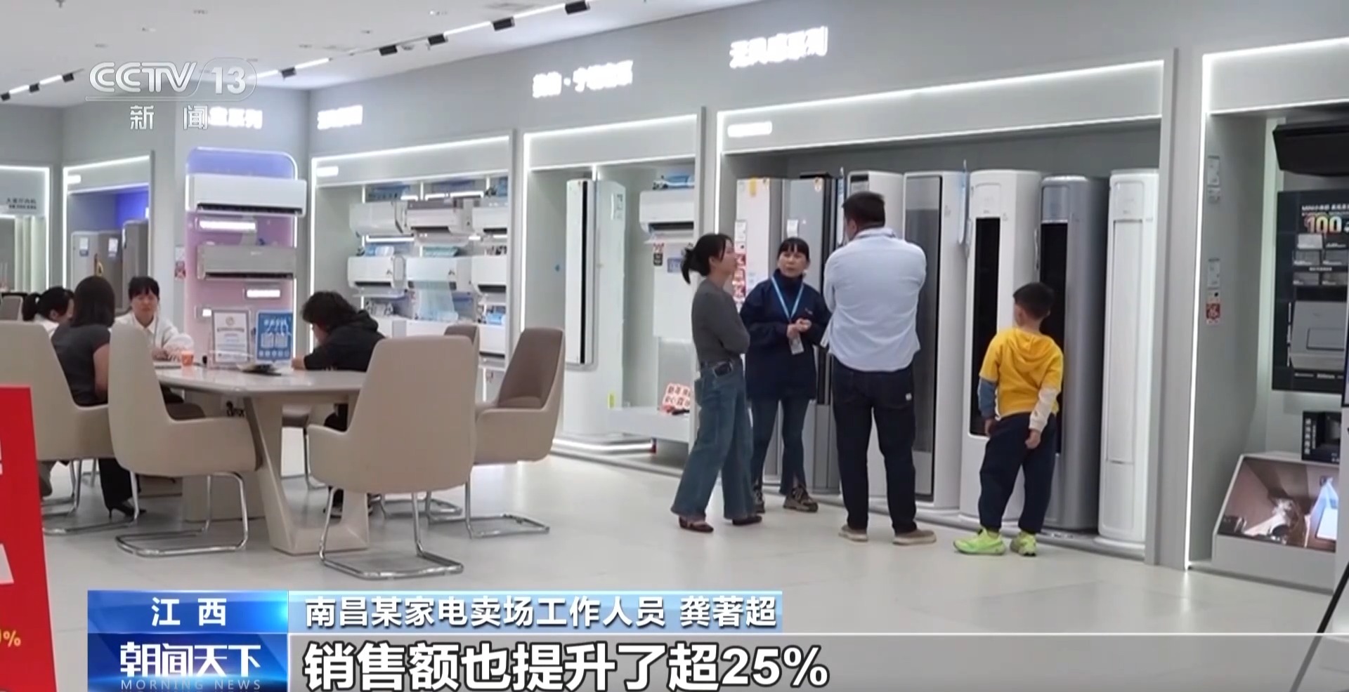 南昌某家电卖场工作人员 龚著超:近期我们门店的客流量较平时增长了30%,销售额也提升了超25%。其中,智能家电、绿色节能家电尤其受到消费者欢迎,销量占比也接近六成。