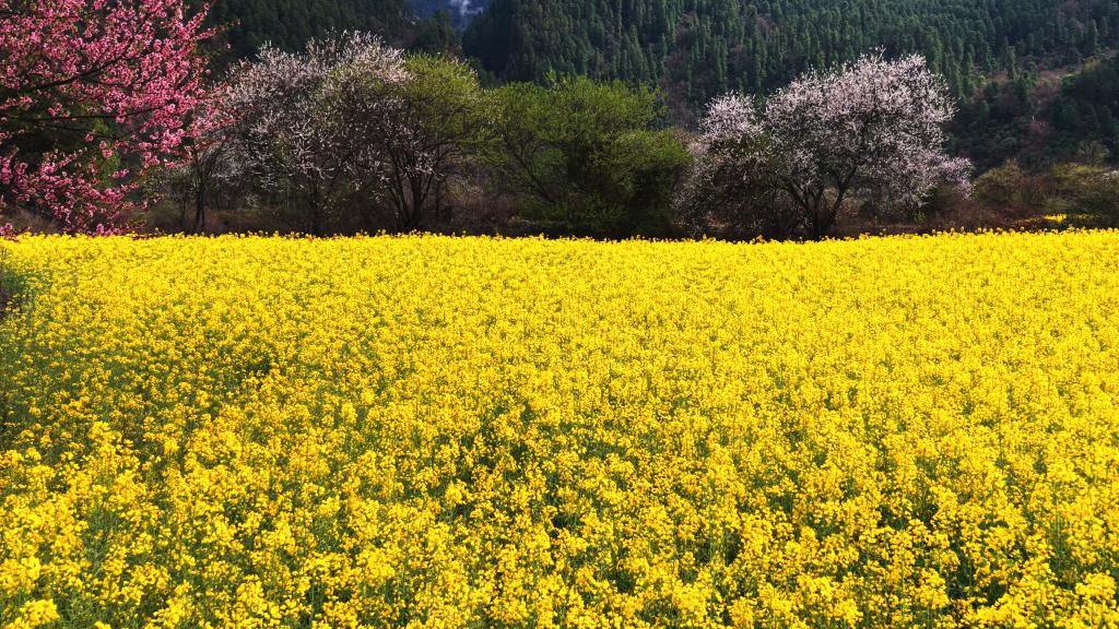 西藏林芝市波密县易贡乡,油菜花与桃花迎春绽放。新华社记者 普布次仁 摄