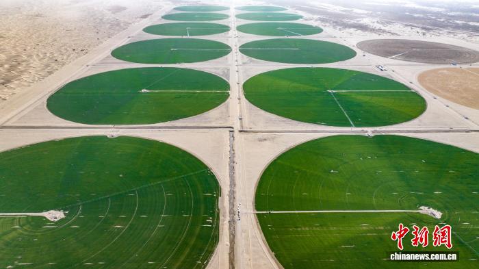 中新网乌鲁木齐4月11日电 (张家伟 赵凯)近日,塔克拉玛干沙漠南缘的漫漫黄沙中,一抹浓淡相间的绿色“同心圆”,与周边苍茫寂寥的沙漠形成震撼对比。这是新疆生产建设兵团第十四师昆玉市建设者用一年时间,在7.38万亩沙漠治理区绘就的生态画卷,实现一场“沙漠变良田”的蜕变。